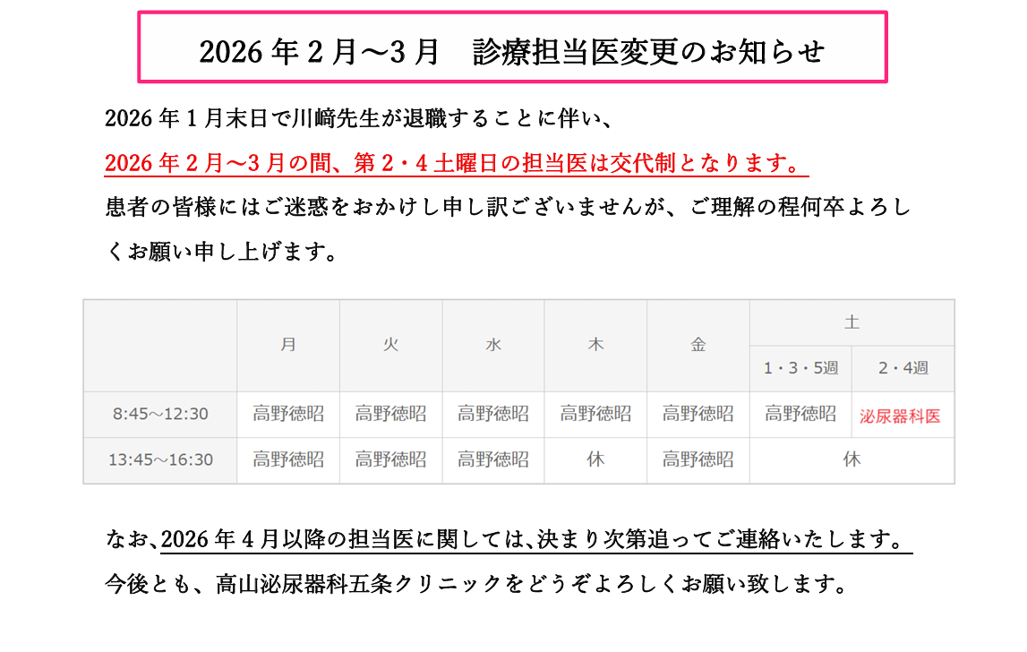 2026年2月以降 第2・4土曜日担当医変更のお知らせ